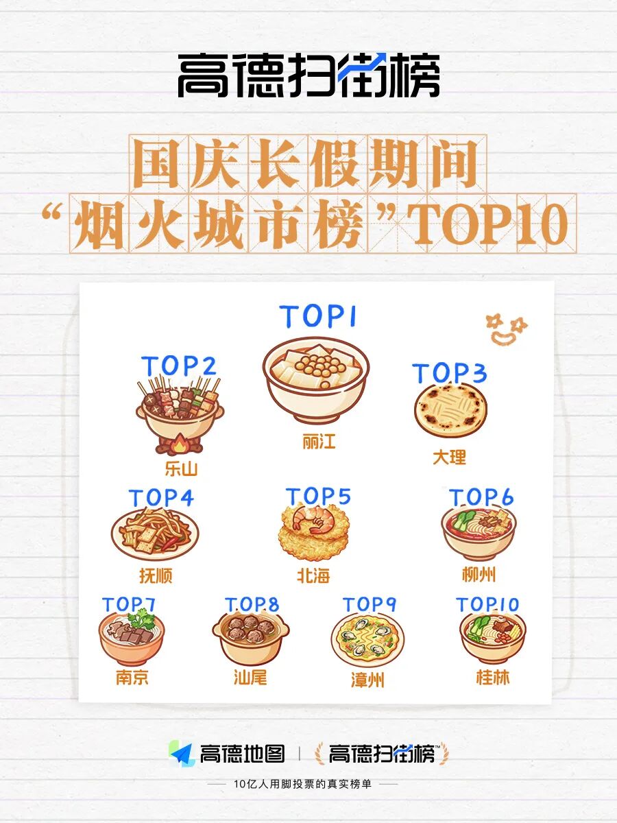 10月1日~7日,高德扫街榜“烟火城市榜”的前10名依次是:丽江、乐山、大理、抚顺、北海、柳州、南京、汕尾、漳州和桂林。这些城市上榜烟火小店的流量占比最高,其中6个是公认的旅游城市。