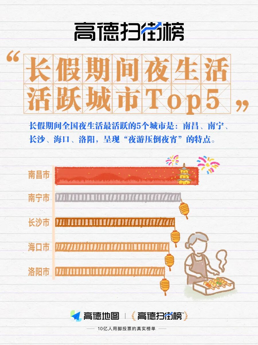 长假旅游需求呈现细分化特点,推动整体潜力加速释放。高德数据显示,长假期间全国夜生活最活跃的5个城市是:南昌、南宁、长沙、海口、洛阳。从夜间娱乐消费的具体内容看,南昌、南宁和洛阳最火热的项目是逛景区,只有长沙的夜生活首选是吃美食,呈现“夜游压倒夜宵”的特点。