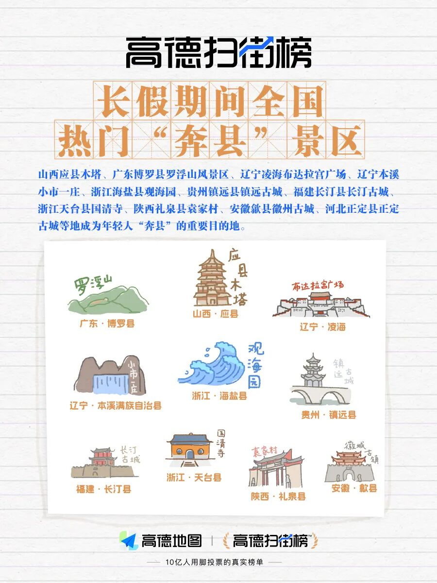 高德扫街榜数据显示,长假期间,山西应县木塔、广东博罗县罗浮山风景区、辽宁凌海布达拉宫广场、辽宁本溪小市一庄、浙江海盐县观海园、贵州镇远县镇远古城、福建长汀县长汀古城、浙江天台县国清寺、陕西礼泉县袁家村、安徽歙县徽州古城、河北正定县正定古城等地跻身全国热门景区,成为年轻人“奔县”的重要目的地。