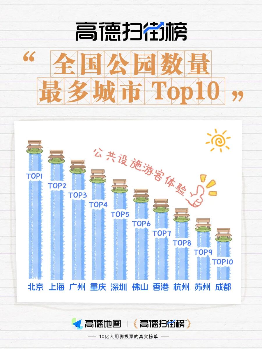 全国公园数量最多的10个城市依次是:北京、上海、广州、重庆、深圳、佛山、香港、杭州、苏州、成都。人均拥有公园数量最多的10个城市依次是:香港、佛山、北京、珠海、福州、江门、杭州、广州、东莞、温州。