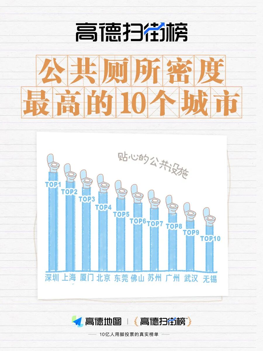 高德扫街榜的数据显示,中国公共厕所最多的10个城市依次是:北京、上海、杭州、重庆、苏州、武汉、成都、深圳、宁波、广州。公共厕所密度最大的10个城市依次是:深圳、上海、厦门、北京、东莞、佛山、苏州、广州、武汉、无锡。