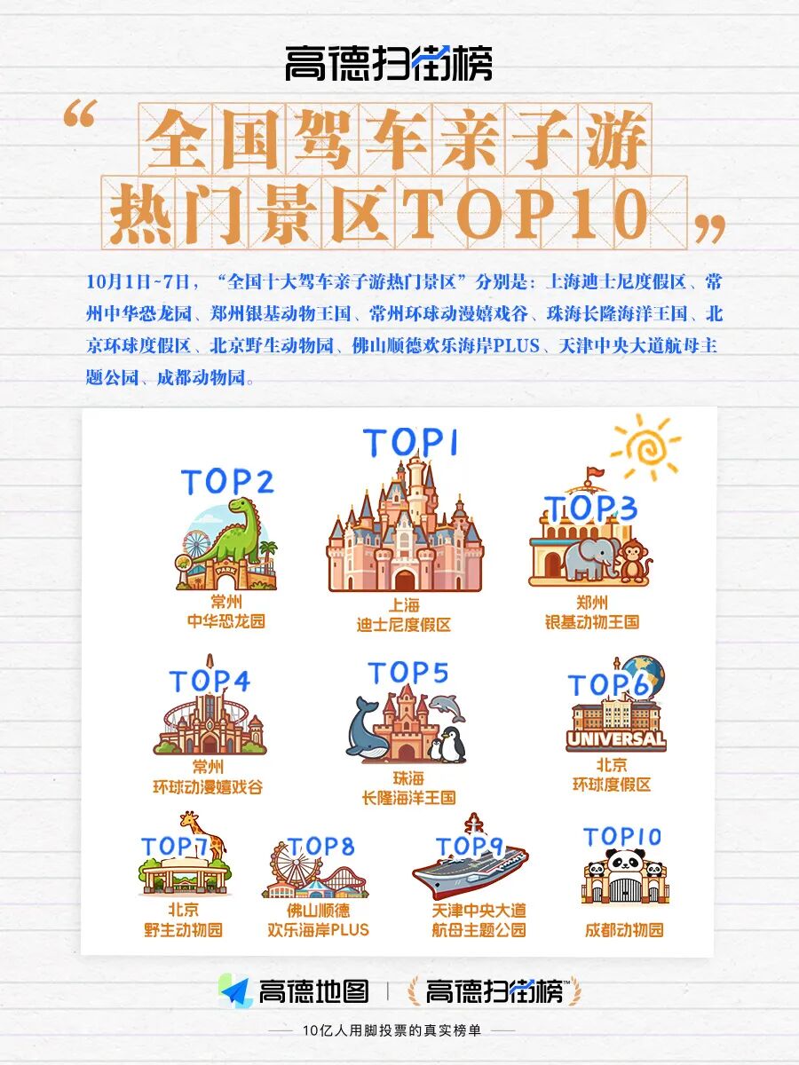 10月1日~7日,“全国十大驾车亲子游热门景区”分别是:上海迪士尼度假区、常州中华恐龙园、郑州银基动物王国、常州环球动漫嬉戏谷、珠海长隆海洋王国、北京环球度假区、北京野生动物园、佛山顺德欢乐海岸PLUS、天津中央大道航母主题公园、成都动物园。这些亲子游景区所在的城市中,佛山、成都和上海位列《长假驾车游热门迁入城市榜》的前10名。通过苏超联赛火爆出圈的常州有两个景区上榜。