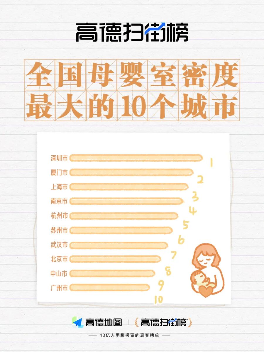 全国母婴室密度最大的10个城市依次是:深圳、厦门、上海、南京、杭州、苏州、武汉、北京、中山、广州。